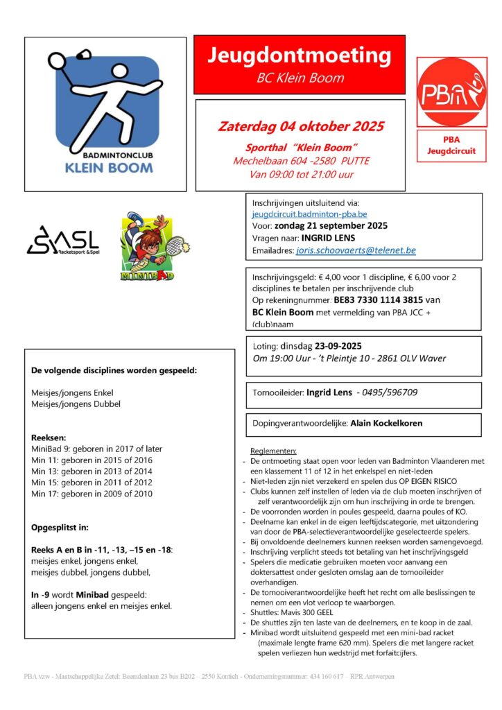 Aankondiging : PBA Jeugdcircuit : BC Klein Boom 4/10/2025