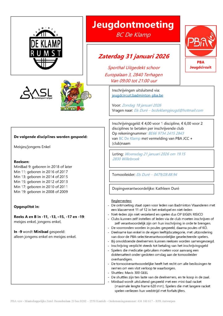 Aankondiging : PBA Jeugdcircuit : BC De Klamp 31/01/2026