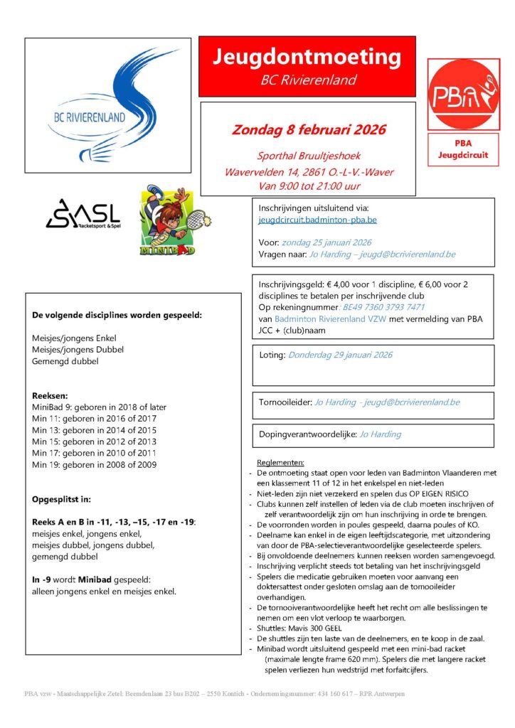 Aankondiging : PBA Jeugdcircuit : BC Rivierenland 8/02/2026