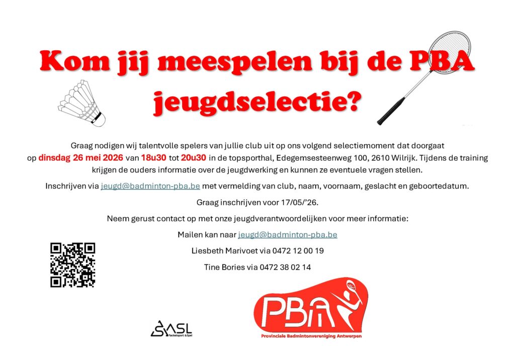 Aankondiging : PBA Selectiedag Dinsdag 26 mei 2026
